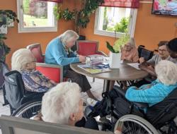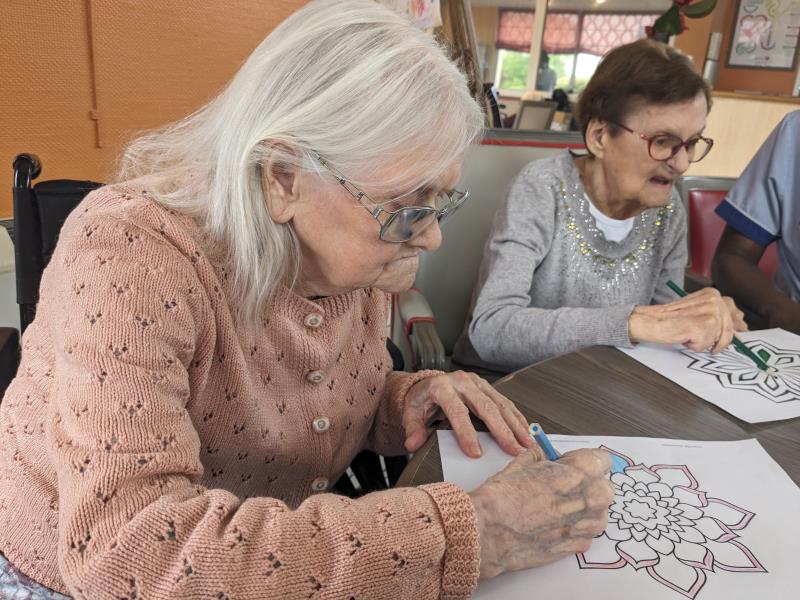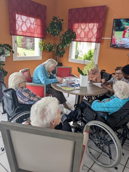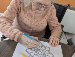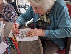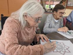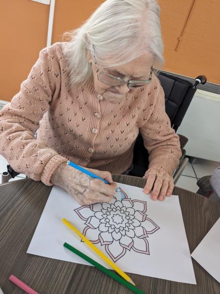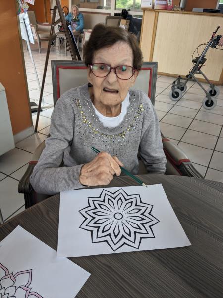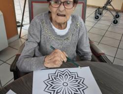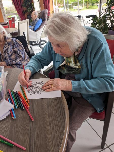 Mercredi après midi, l'aide soignante Pauline a continué, avec quelques résidents, son activité de mise en couleurs de Mandala. Les résidents étaient ravis de participer. Un projet qui prend forme un peu plus chaque jour de participation des résidents.