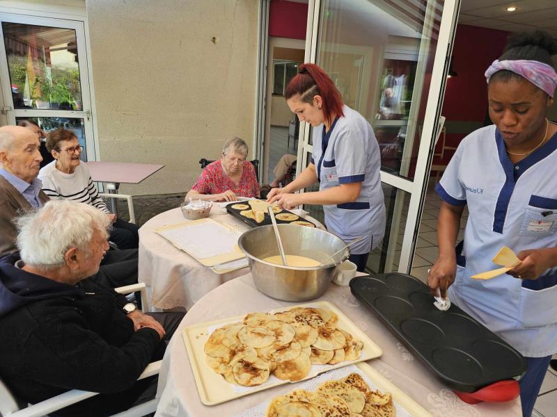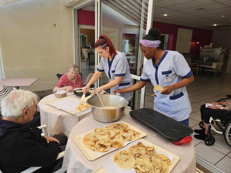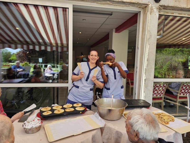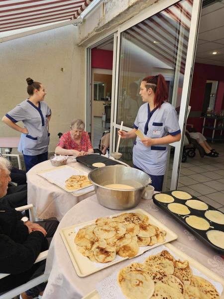 Samedi après midi, les aides soignantes ont organisé une activité crêpes sur la terrasse de la résidence. Le soleil présent ce jour, chacun a pu en profiter. Un moment de gourmandise ensoleillé. Ensuite, les crêpes ont été apportées à tous, en chambre, au salon pour profiter d'un temps de dégustation.