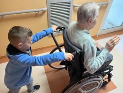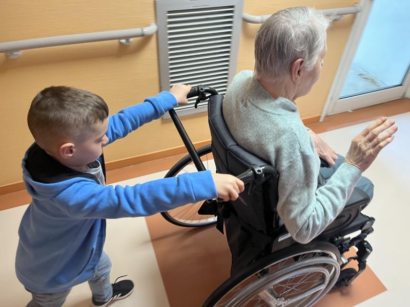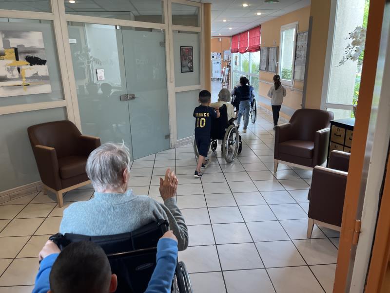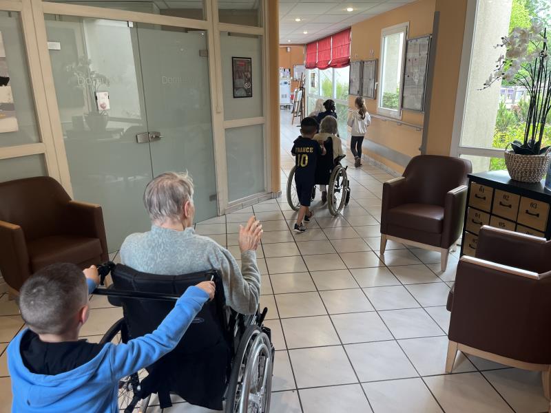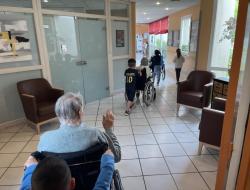 Les enfants ont même voulu participer et faire une balade avec les résidents. Chacun leur tour, ils voulaient accompagner les résidents en fauteuil. Cela a fait beaucoup rire les résidents. Un bon moment de rigolade pour petits et grands.