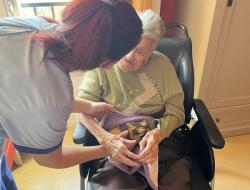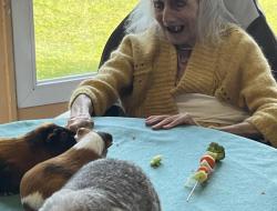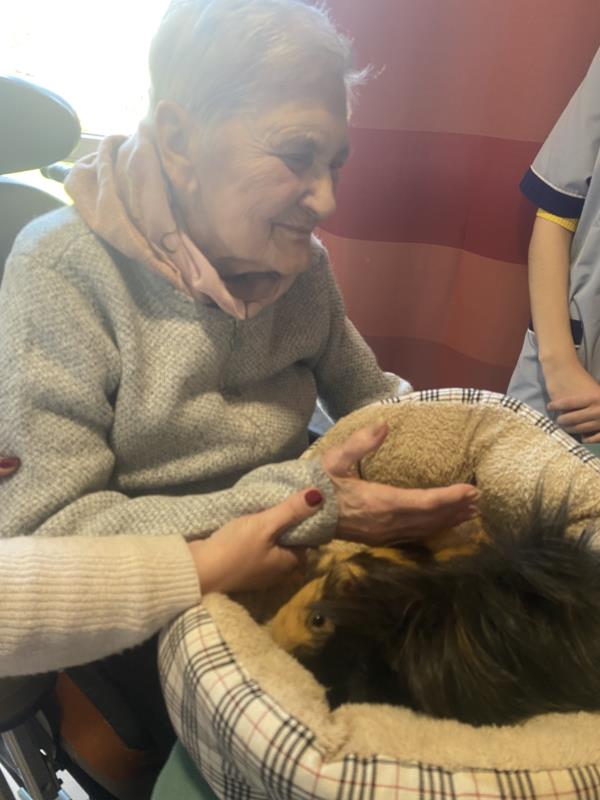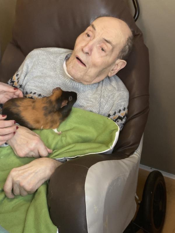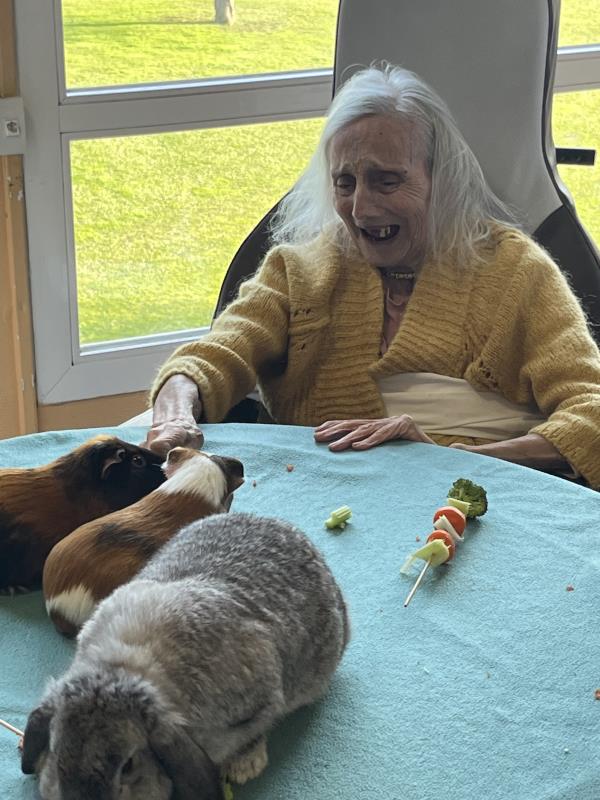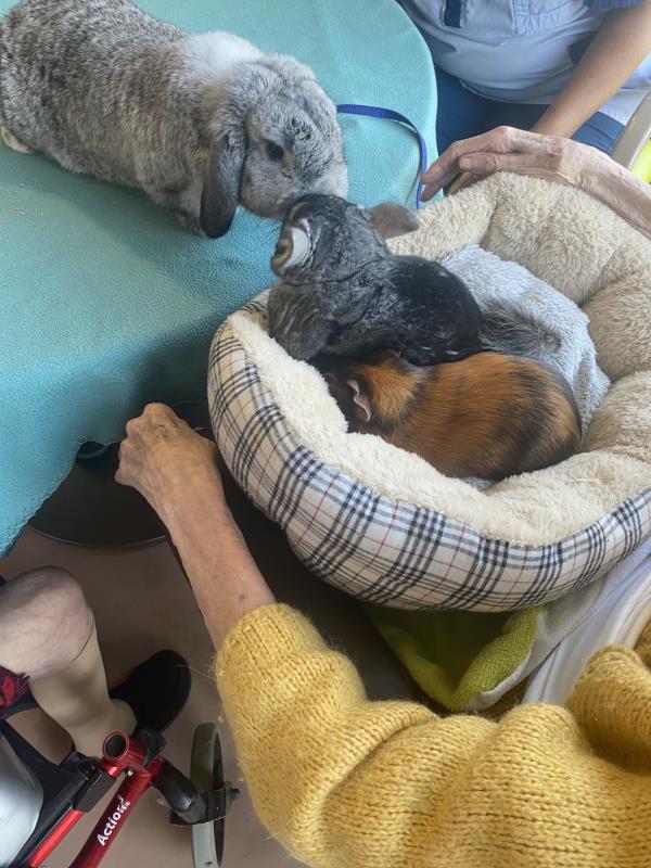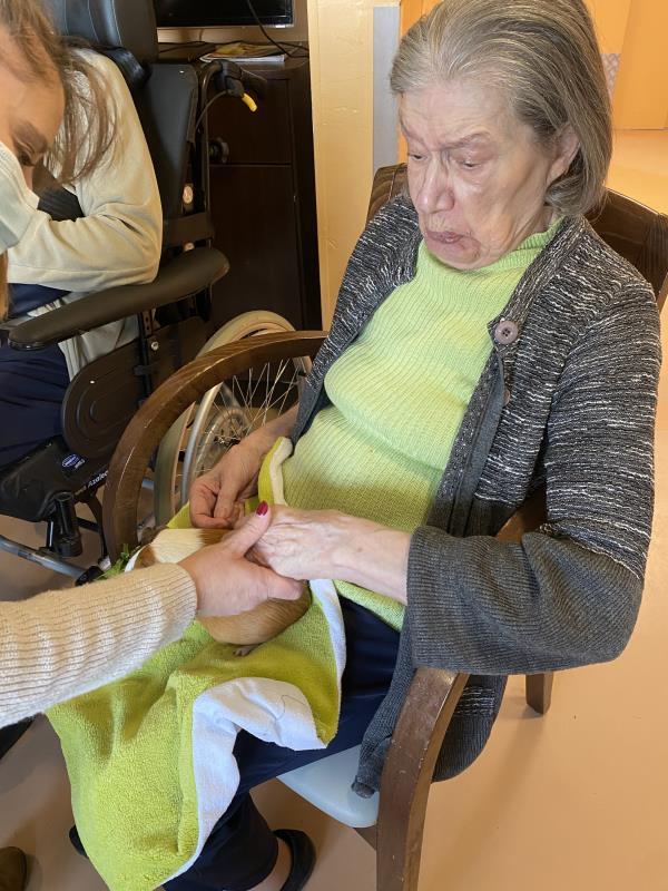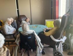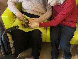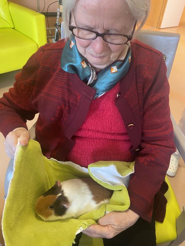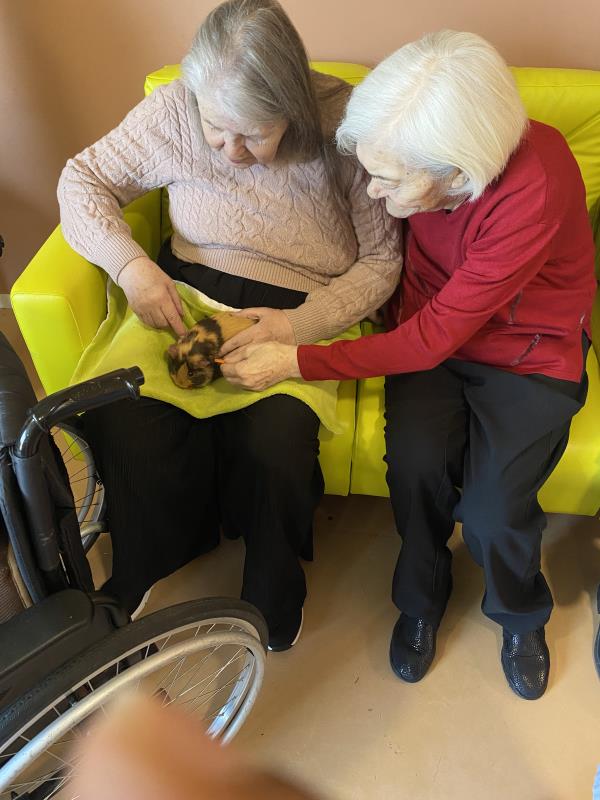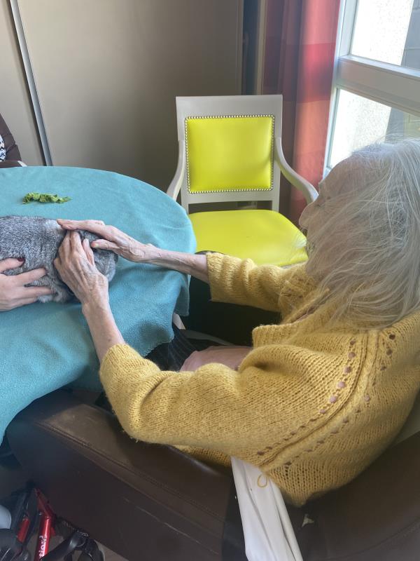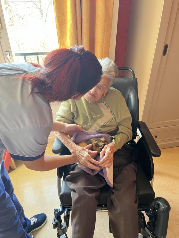 Mardi après midi a eu lieu la médiation animale pour la première fois en 2024. Guimauve, Muffins, Spéculos et leurs amis, ainsi que Vanessa leur maîtresse, sont venus souhaiter une bonne année aux résidents. C'est au salon du 2ème étage qu'ils ont commencé leur séance de câlins, et se sont même faufiler dans quelques chambres, pour le plus grand bonheur des résidents.