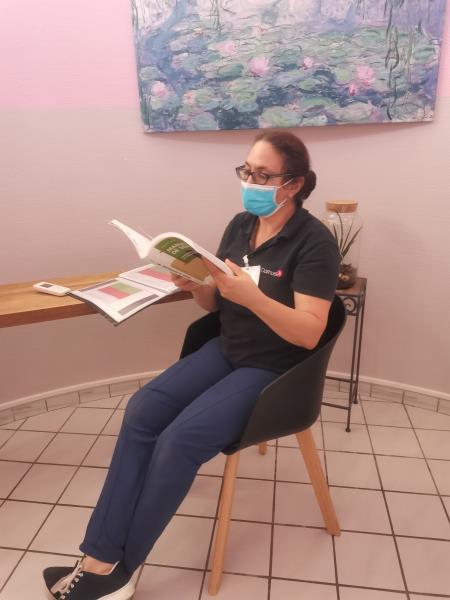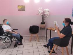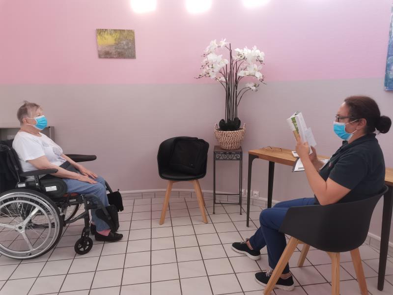 Malika qui a reçu la formation et est diplômée, propose des séances de sophrologie plusieurs fois par semaine aux résidents.